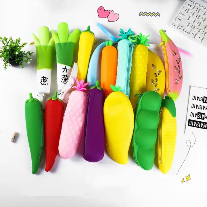 新款可愛卡通卡哇伊蔬菜便攜式硅筆筆袋化妝化妝口袋學校固定盒